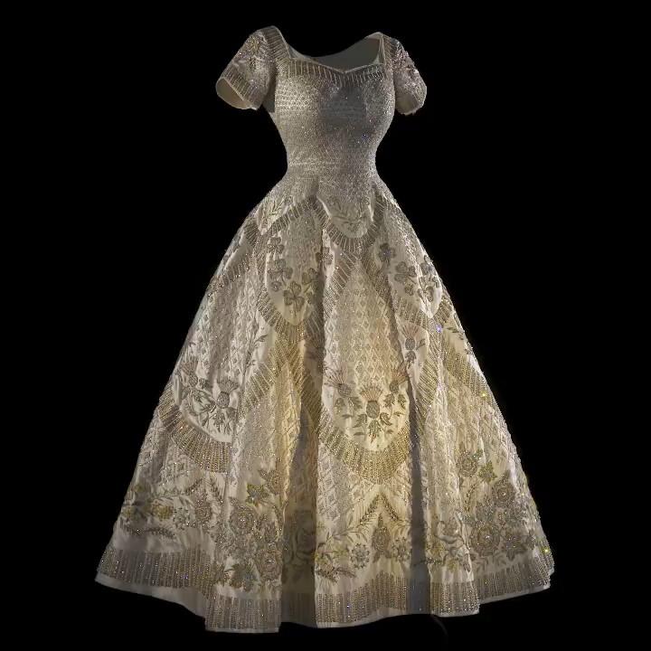 Платье для коронации было разработано Норманом Хартнеллом. Он изготовлен из белого атласа с вышитыми золотом и серебром эмблемами Великобритании и Содружества. Королева Елизавета II также носила красное одеяние (The Robe of State), которое сопровождает её во время ежегодного открытия британского парламента.