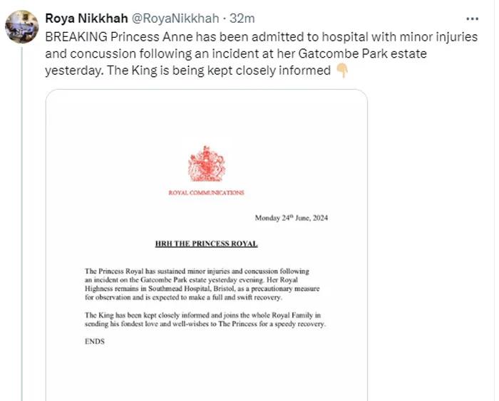 Букингемский дворец сообщил об инциденте в официальном заявлении. Из него мы узнаем, что дочь королевы Елизаветы II всё ещё находится в больнице.