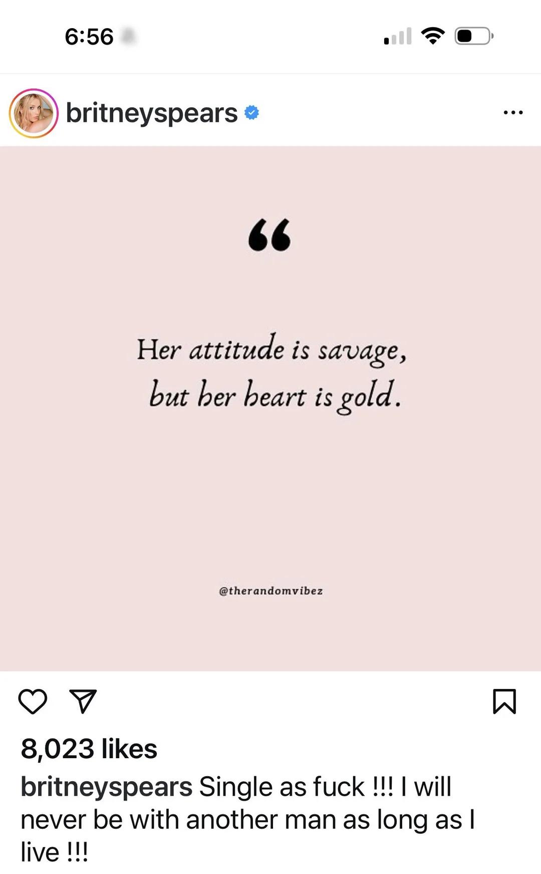 Но это ещё не все, потому что Бритни Спирс также поделилась изображением с красноречивой цитатой: «Её поведение дикое, но её сердце сделано из золота». Под фото также был небольшой комментарий, который, однако, певица быстро заменила на отметку автора фото. Как сообщают зарубежные порталы, в частности: портал «SIX PAGE» под постом поп-принцесса призналась, что одинока. Сохранившуюся запись о семейном положении бритни можно найти нескольких социальных сетях.